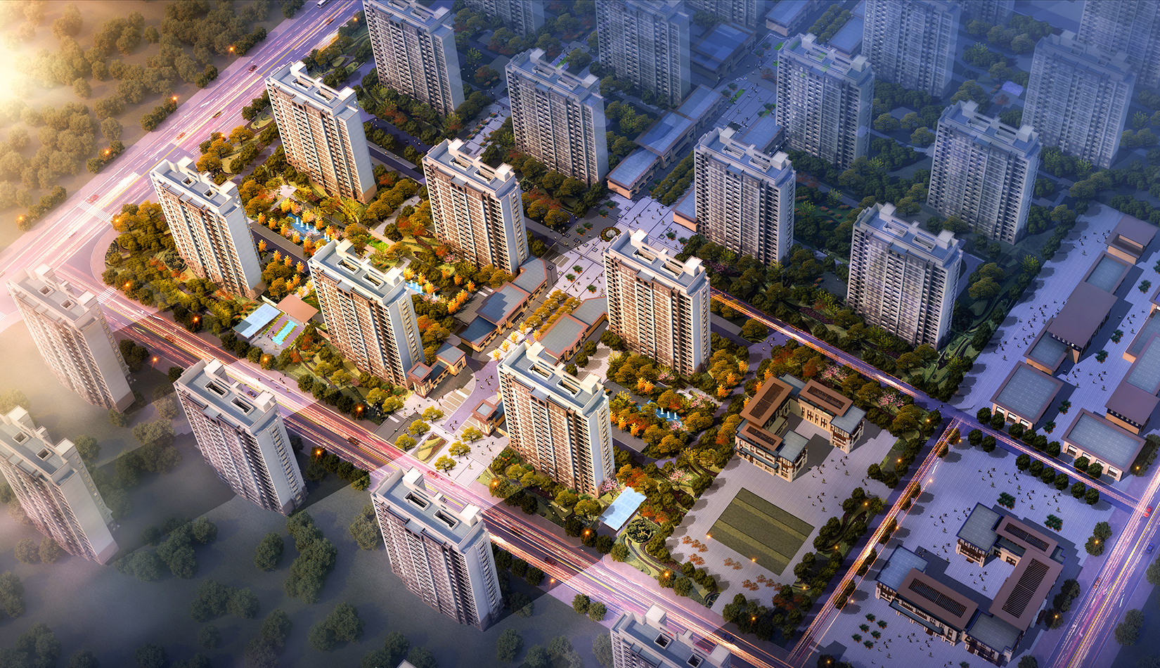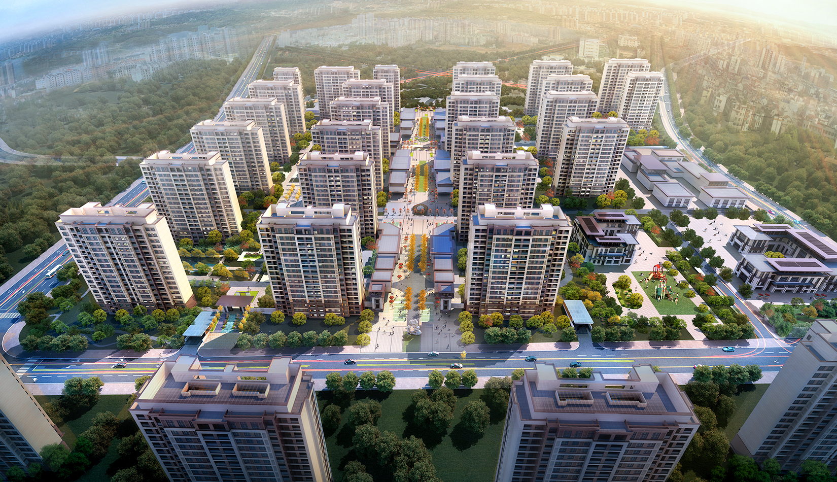 該項目尊重已有地塊規(guī)劃設(shè)計,保留原有空間功能軸線、大小平嶺村安置區(qū)布局;根據(jù)周邊用地、交通情況布局配套商業(yè)、幼兒園。