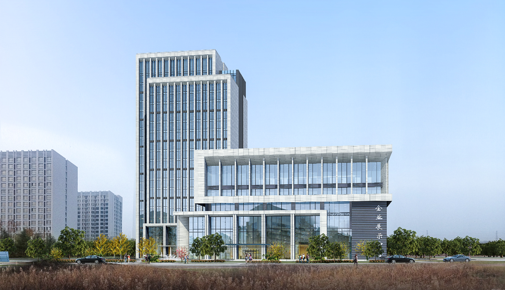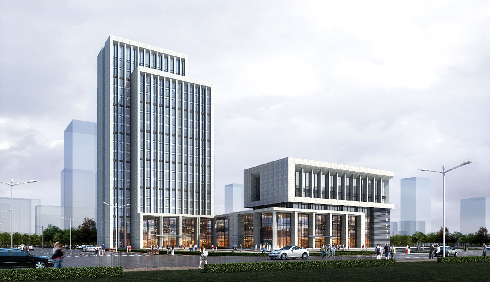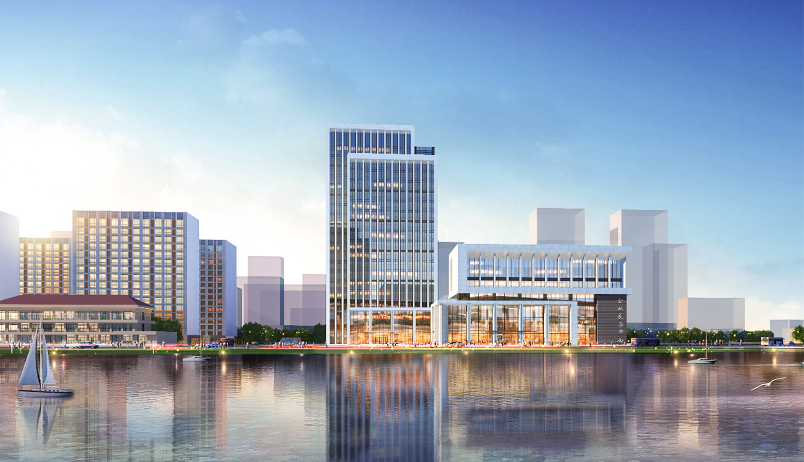 充分利用城市景觀,并形成了自身的樓前集散廣場綠化、沿河休憩景觀,建筑西側公共景觀廣場綠化三大塊景觀帶,并通過景觀軸將三部分聯(lián)系起來。