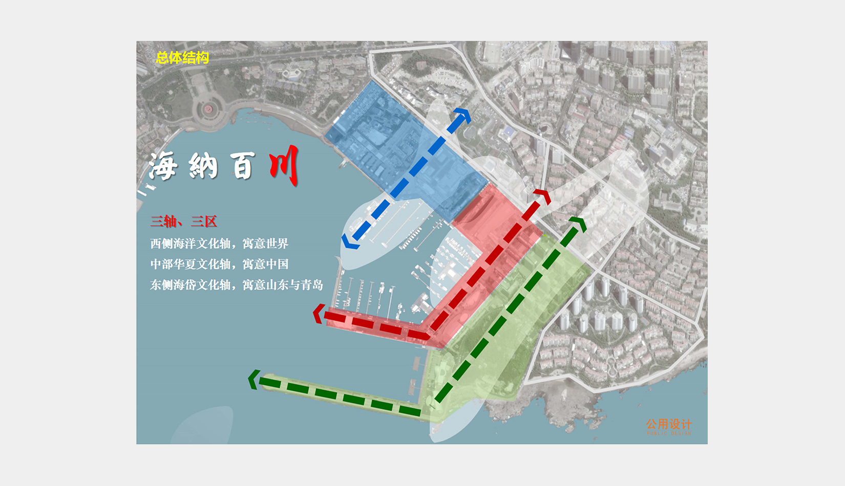 總體規(guī)劃以“青島與世界對(duì)話(huà),合作與發(fā)展共贏”為核心理念,“海納百川、帆揚(yáng)世界”為主題定位,形成了三軸、三區(qū)的“川”字型整體規(guī)劃結(jié)構(gòu)。