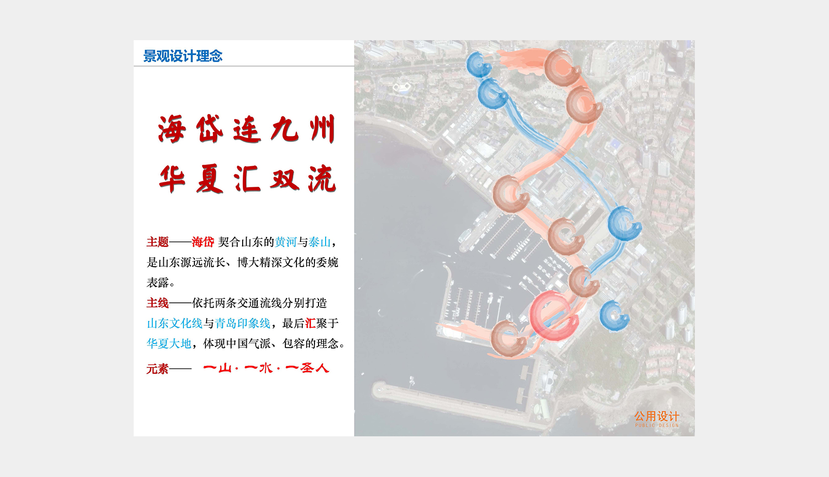 在此基礎(chǔ)上,確定迎賓動(dòng)線(xiàn)方案,完善整個(gè)區(qū)域動(dòng)態(tài)及靜態(tài)交通規(guī)劃,結(jié)合奧帆中心原有的景觀(guān)資源和山東、青島文化元素,以“海岱連九州,華夏匯雙流”為景觀(guān)設(shè)計(jì)理念,布局重要景觀(guān)標(biāo)志節(jié)點(diǎn)。