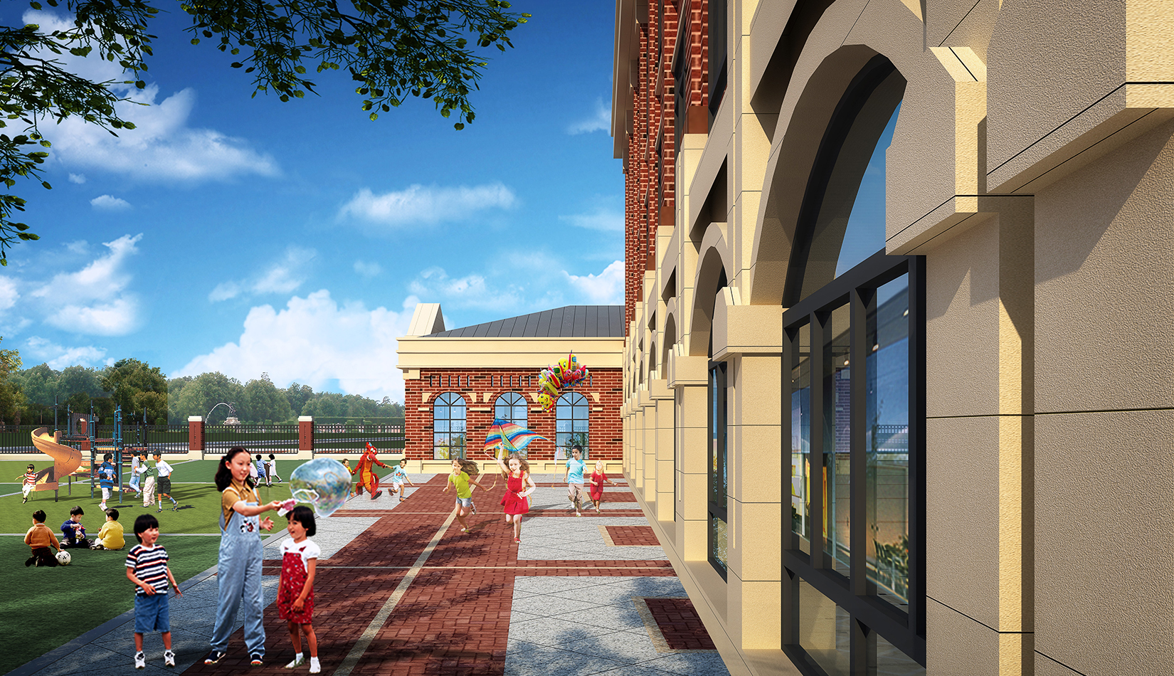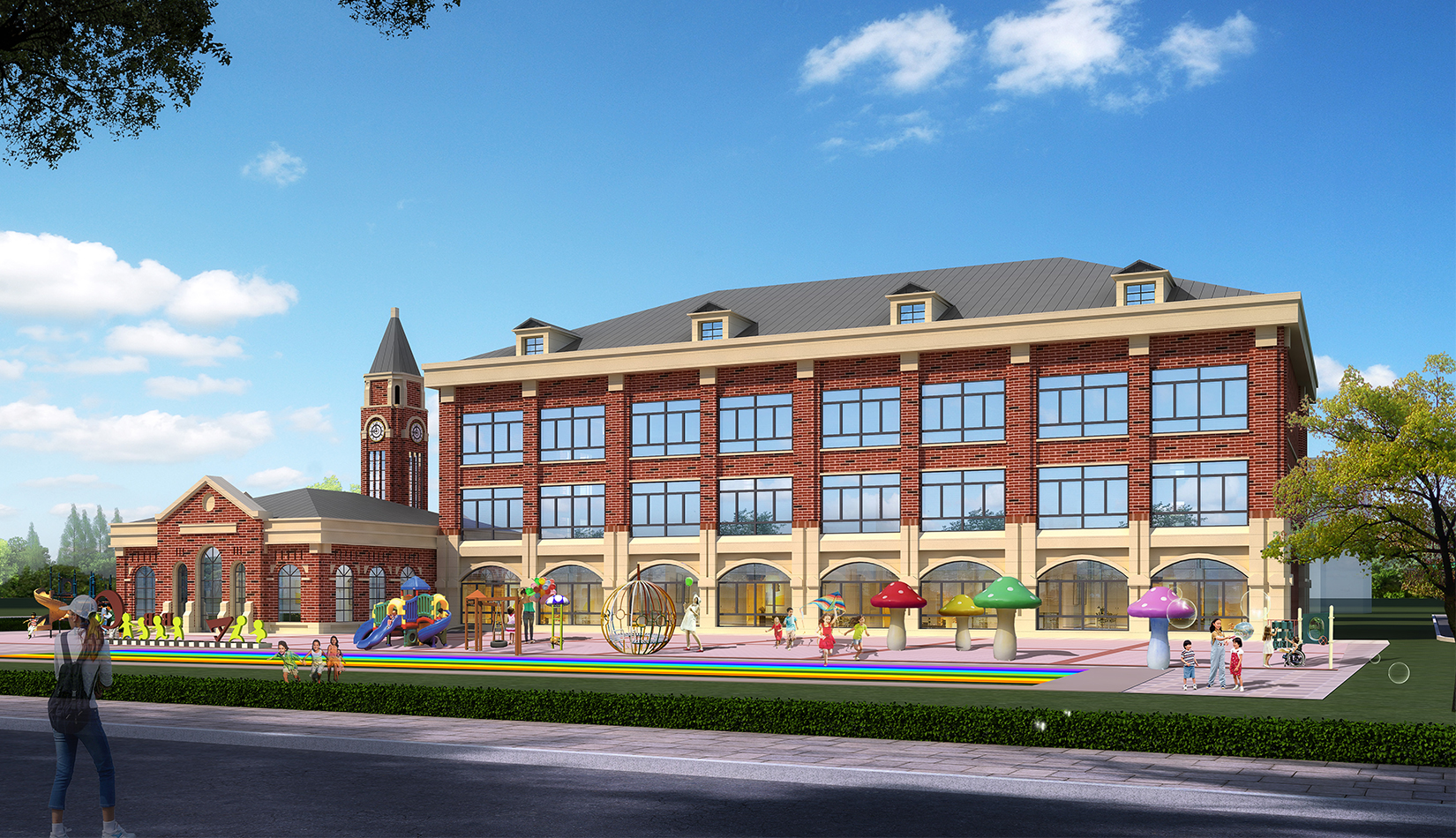 項目在設計中從幼兒特點考慮,通過活動空間、明快色彩以及建筑造型的展示,意在創(chuàng)造符合幼兒心理的童話世界。