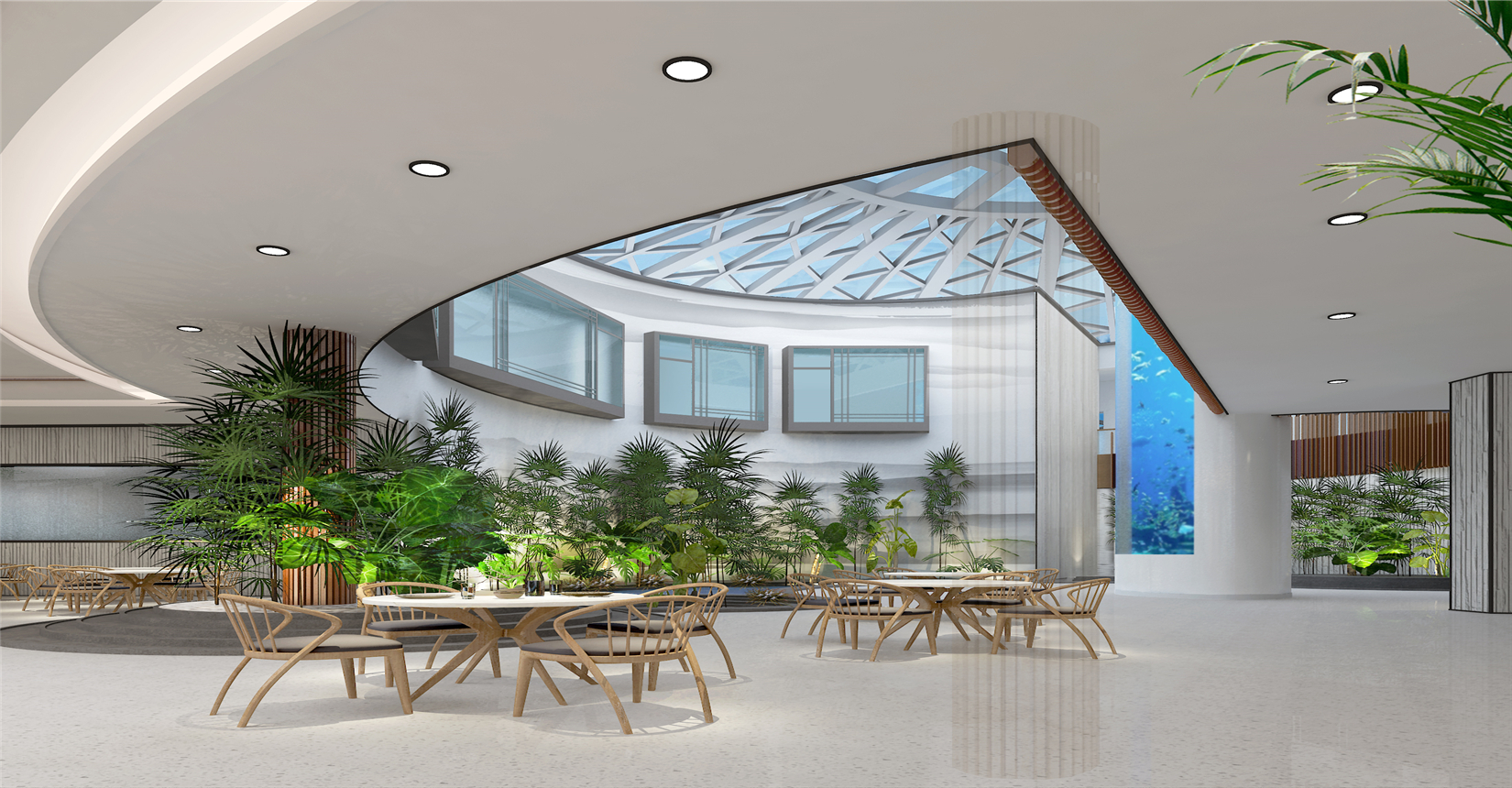 電影院在內(nèi)部空間造型設(shè)計上延續(xù)建筑外立面海螺鋼結(jié)構(gòu)美感,以連貫性曲線為特征,做到內(nèi)外形式美感相呼應(yīng)。以白色金屬板材、白色系魔石地坪及綠色植物垂直造景墻面為主材,全方面打造契合濕地文化主題的生態(tài)景觀體系影城。