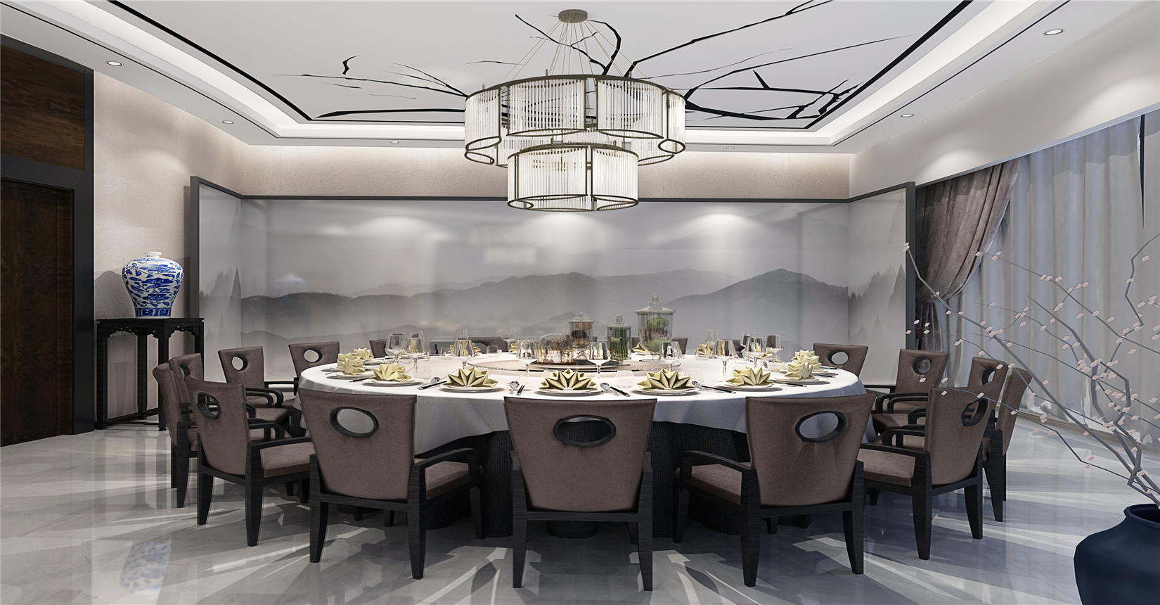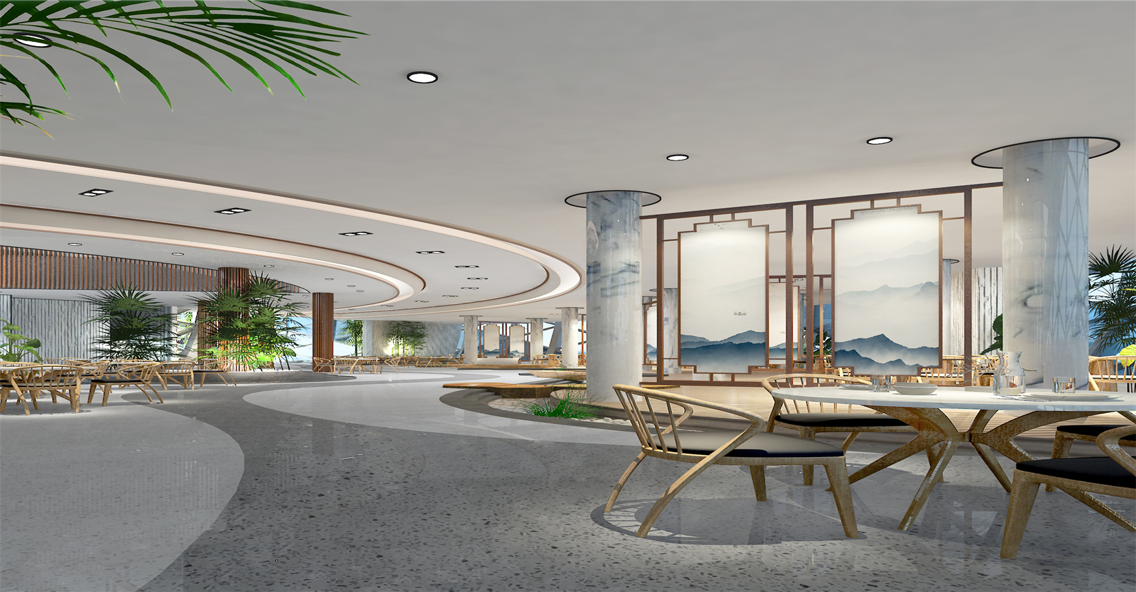餐廳定位區(qū)別于傳統(tǒng)私人生態(tài)農(nóng)莊、農(nóng)家樂,需要更多結(jié)合智慧、科技、現(xiàn)代元素打造生態(tài)內(nèi)核,因此創(chuàng)新性地使用新東方主義設(shè)計風(fēng)格,將東方地域特色的典雅韻味植入于餐廳環(huán)境。在材料的使用上,多使用如花崗玉、裝飾纖維水泥板、仿古磚、防腐木地板等自然材料,突出餐廳的整體生態(tài)氛圍。