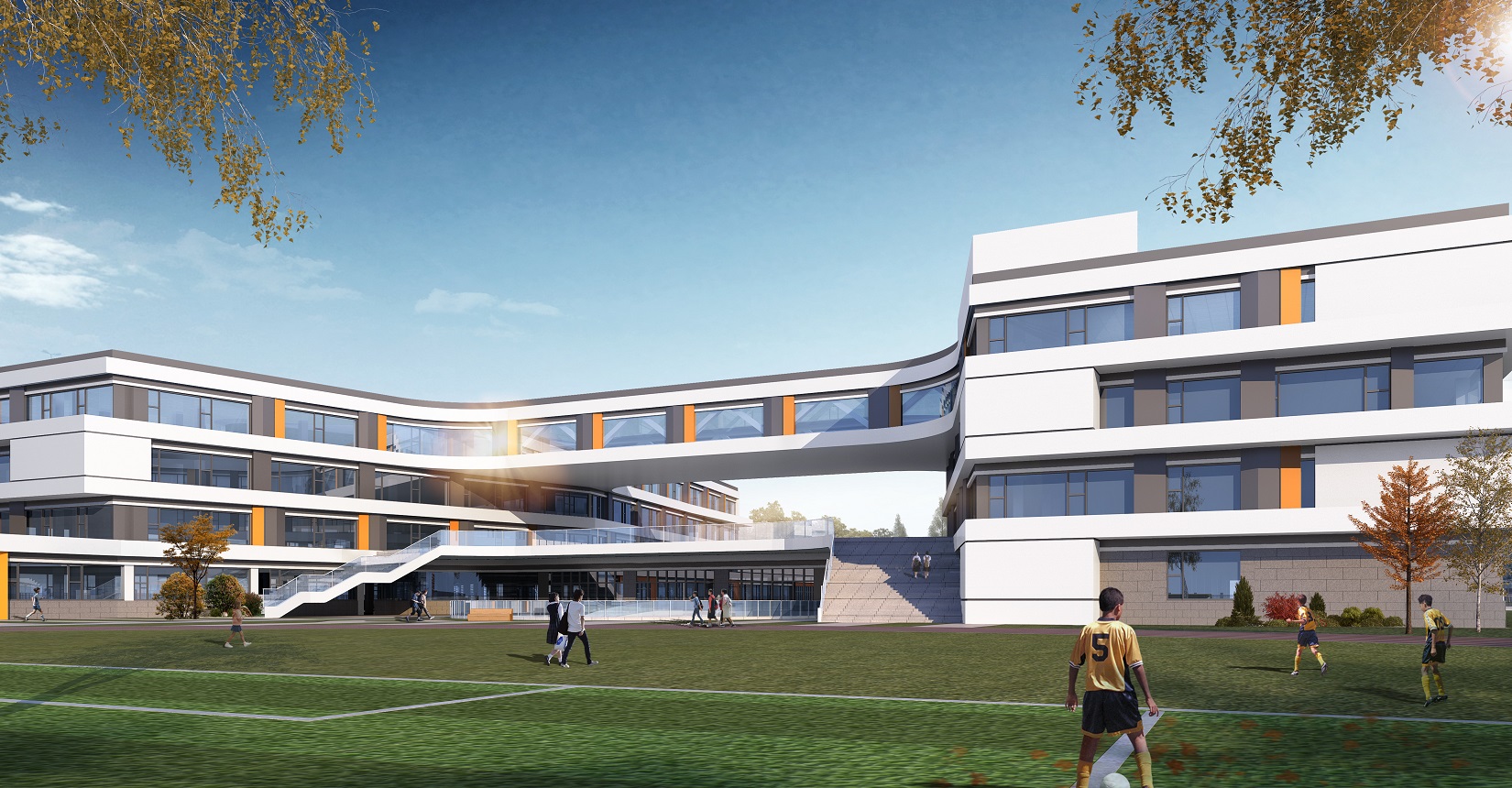 項目設計以“書籍”和“階梯”為靈感,將教學樓以退臺及錯落的形式展示“書籍”和“階梯”的理念,設計現(xiàn)代化“書本”校園,希望學生們在讀書中成長。