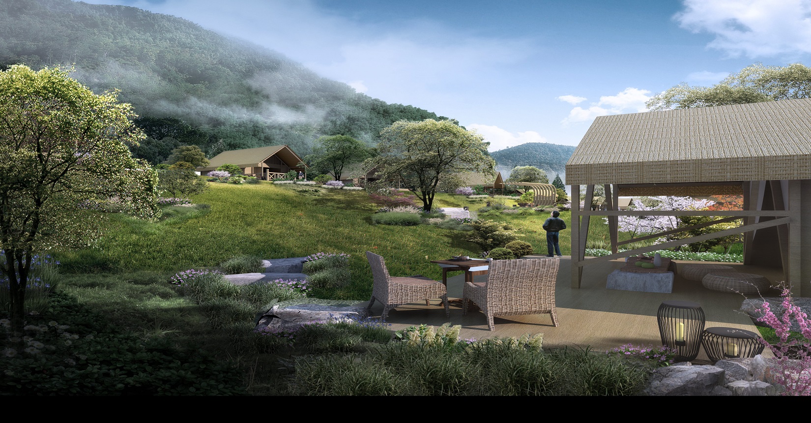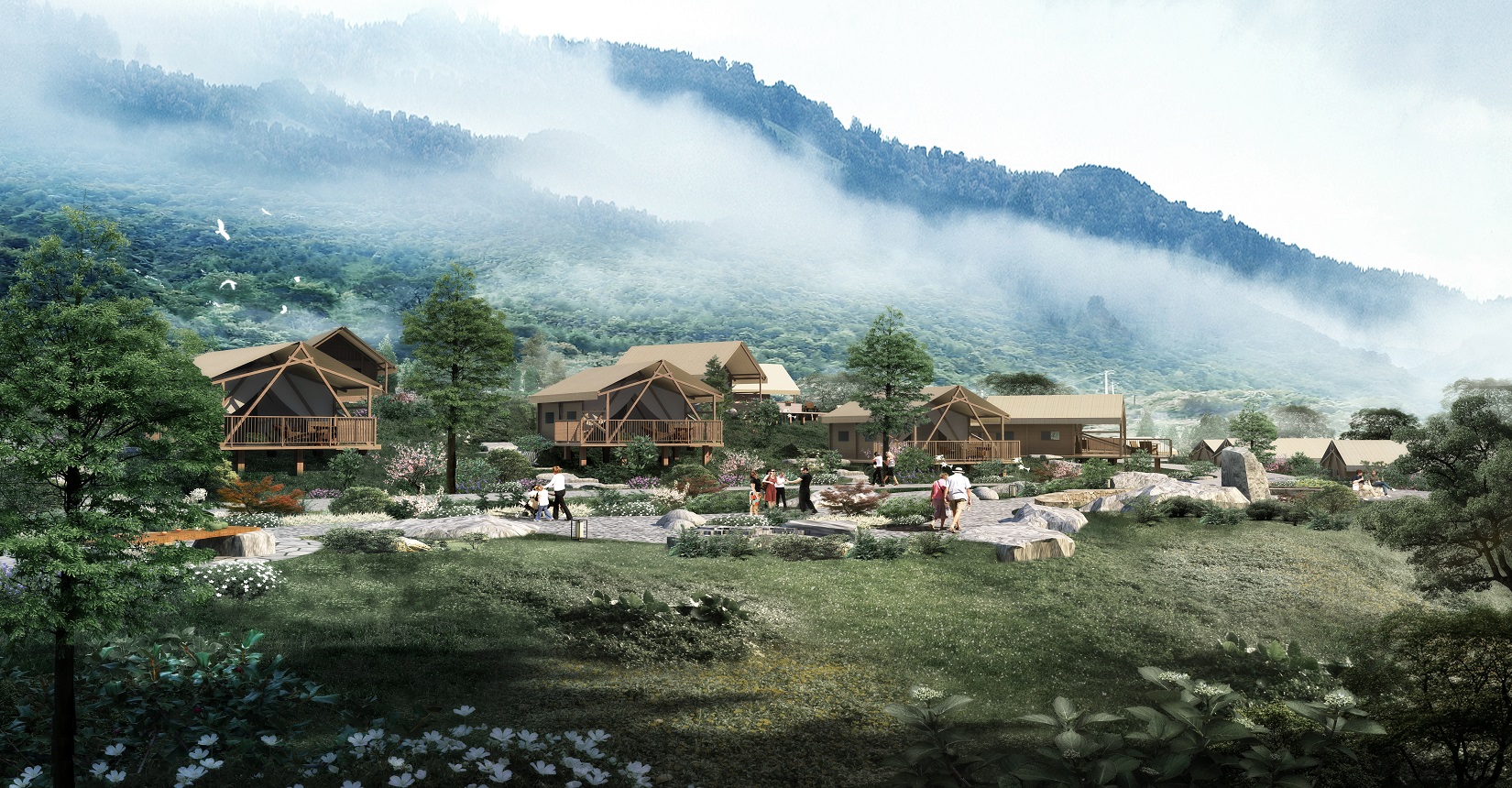 本項目的定位為自然、野奢的景觀風格。對于野奢度假酒店景觀環(huán)境設計遵從“野”“奢”兩點,融入荒野生態(tài)的設計理念,又要與場地相融合、與原生態(tài)相映、與當?shù)氐拿袼罪L情相交匯,突出當?shù)氐奈幕黝},強調高品質的自然、野奢度假,從而打造出一個具備個性與特色,使游客能夠享受到自然野趣體驗的景觀環(huán)境。